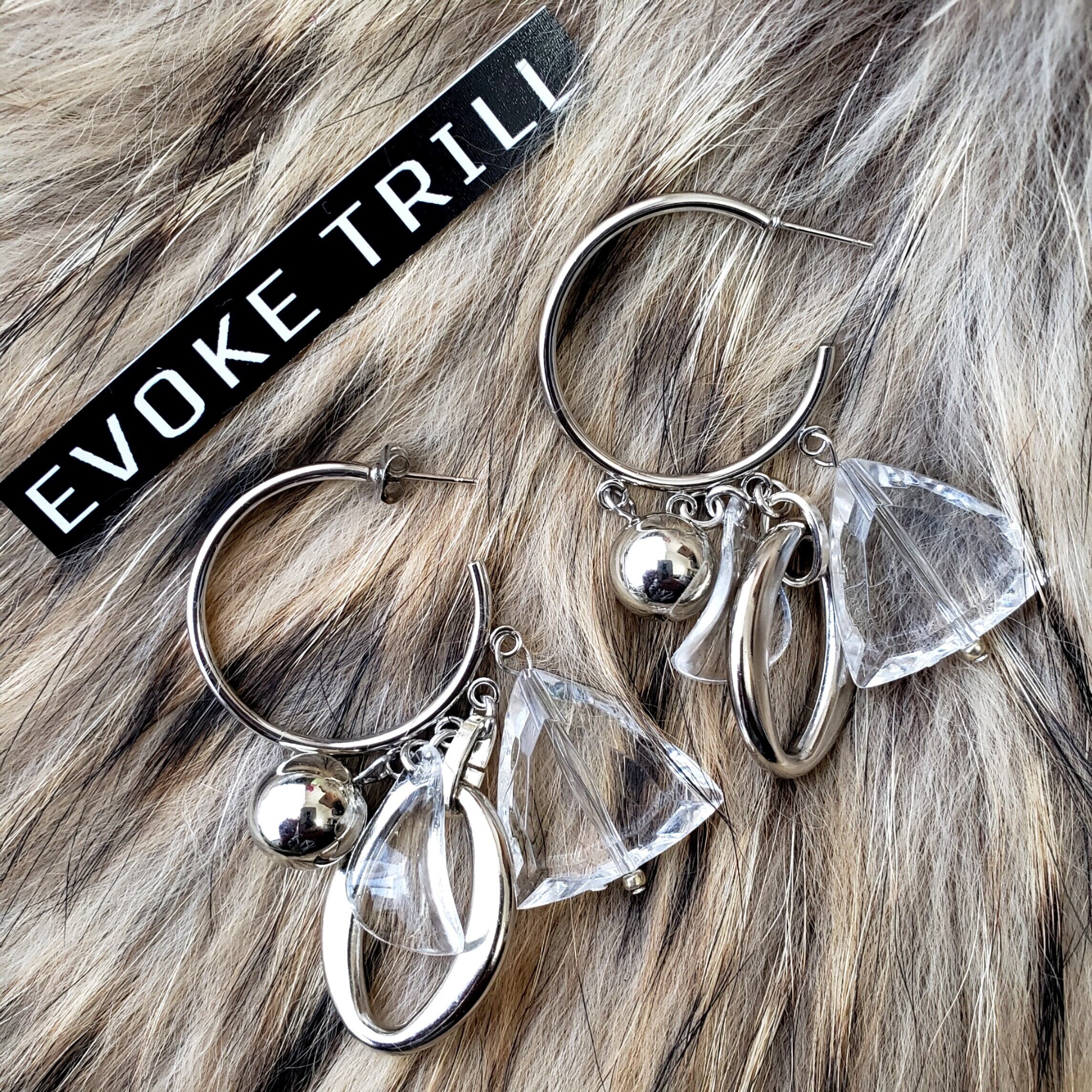 様々な形のビーズがぶら下がったピアスとなります。