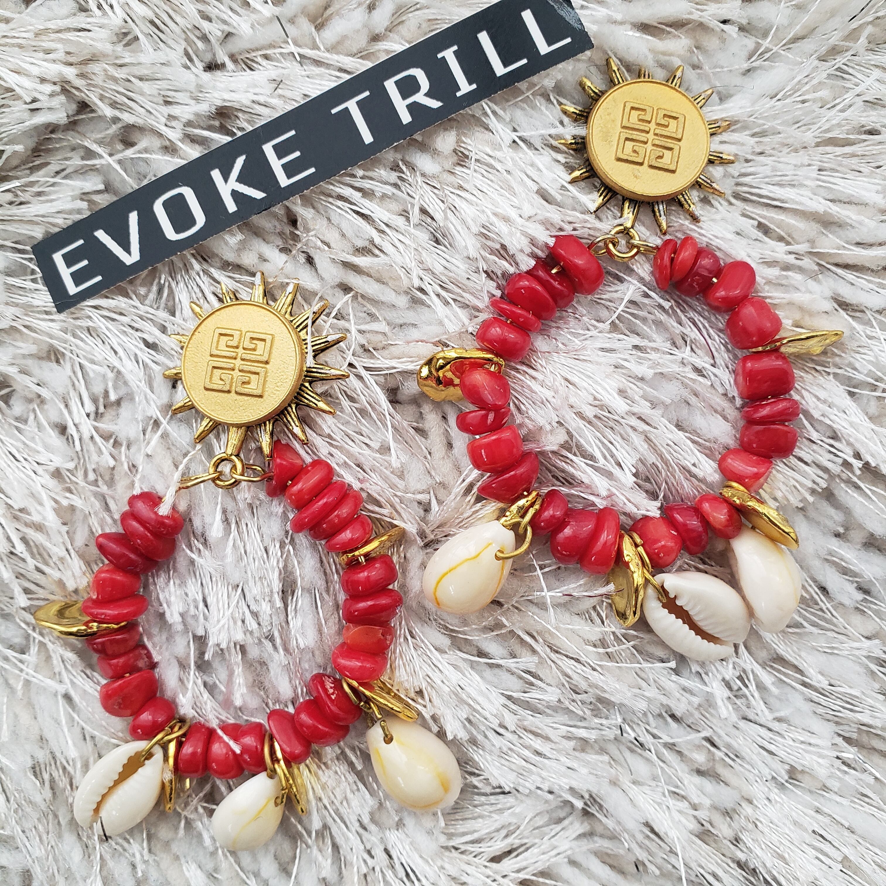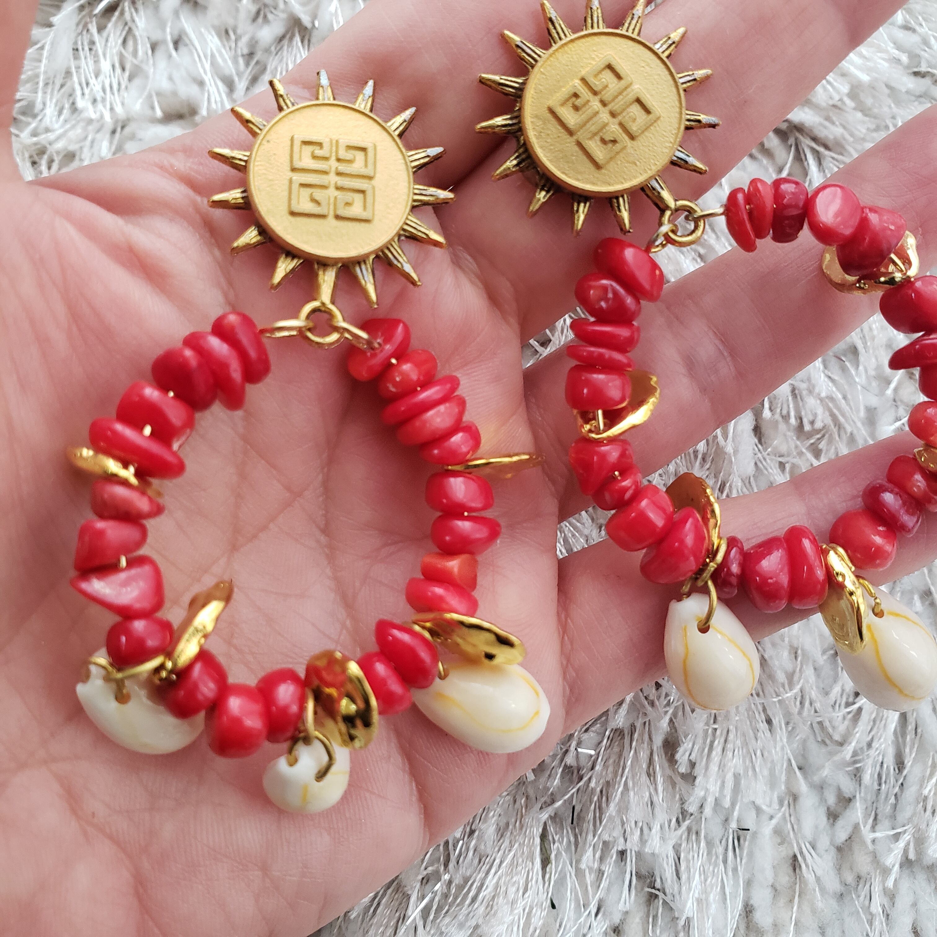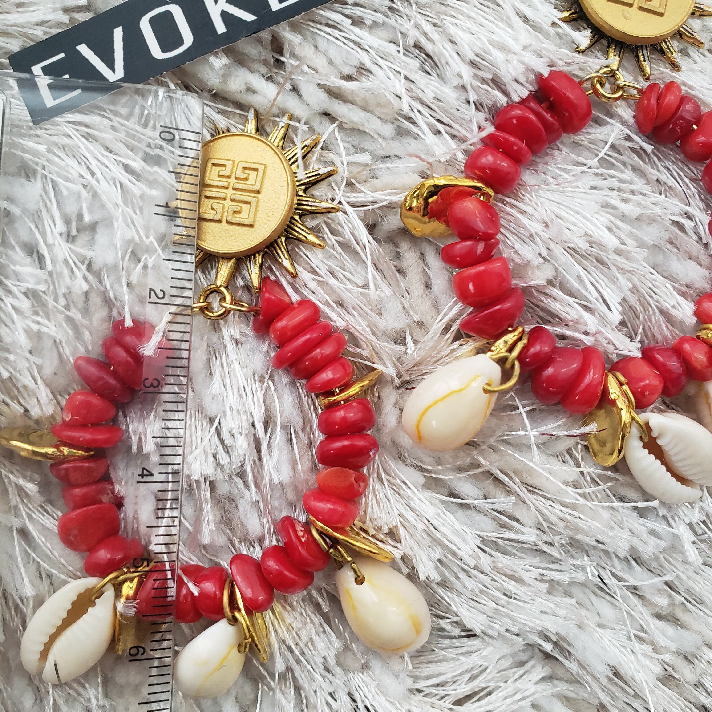 ランダムな赤のサンゴシェルビーズで南国のイメージです。