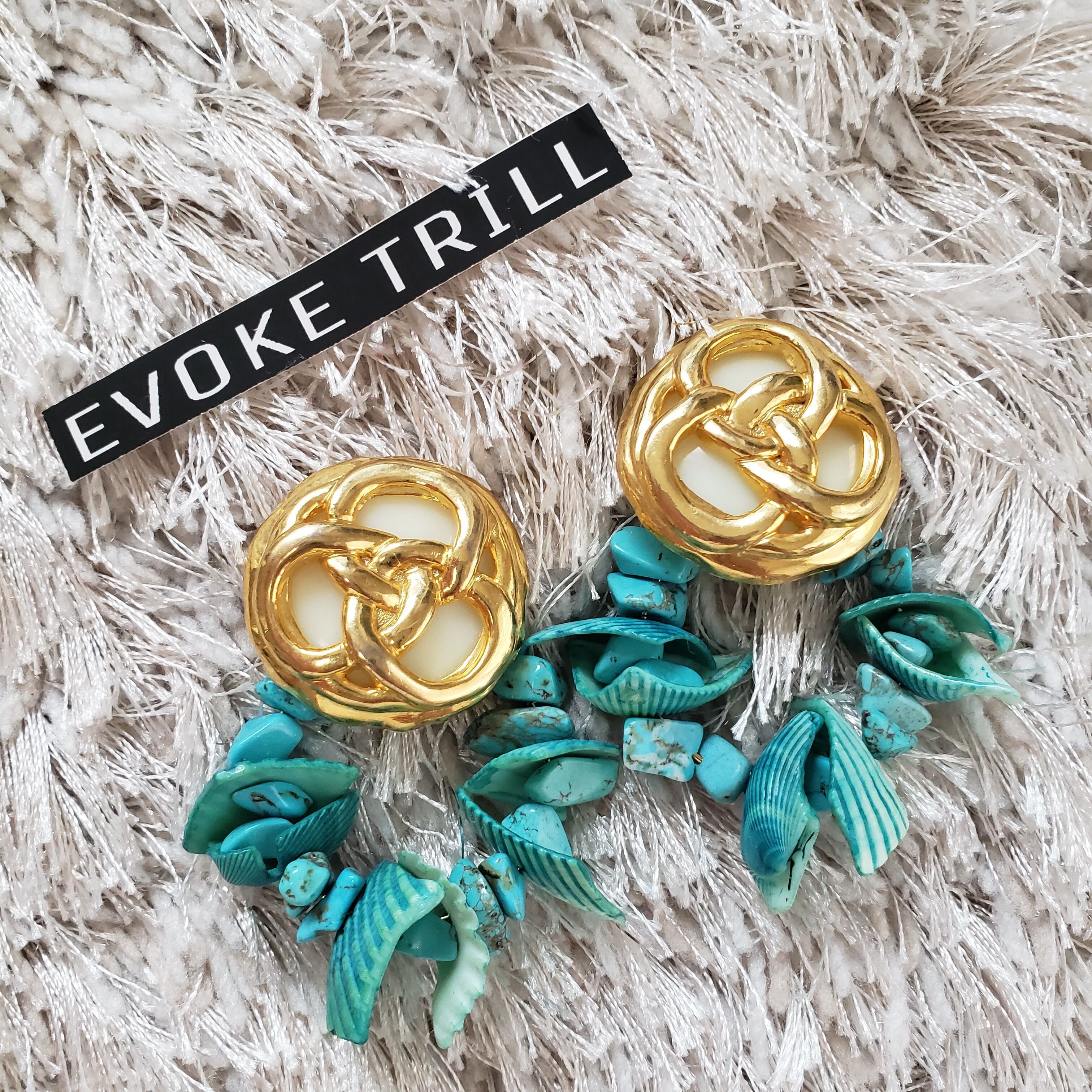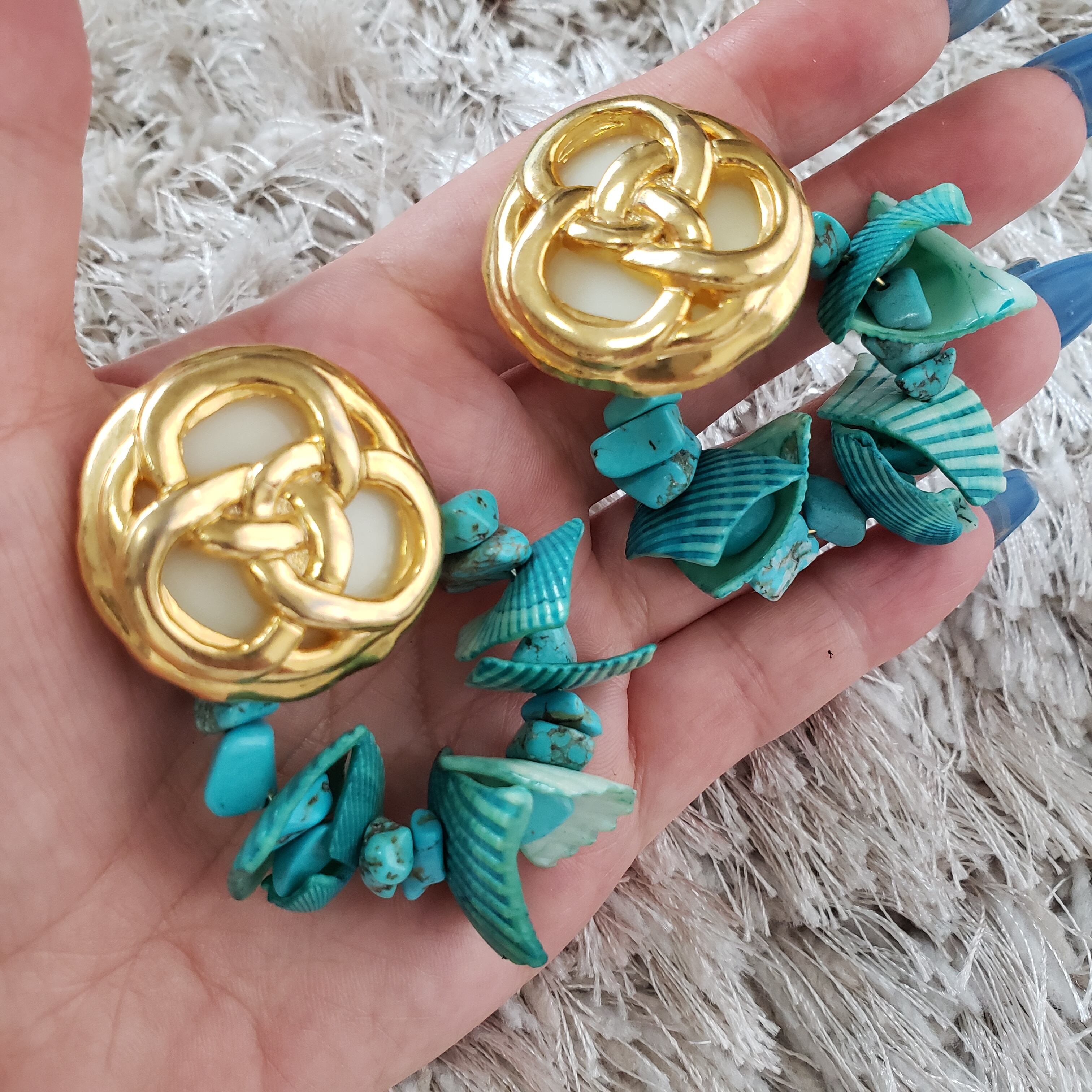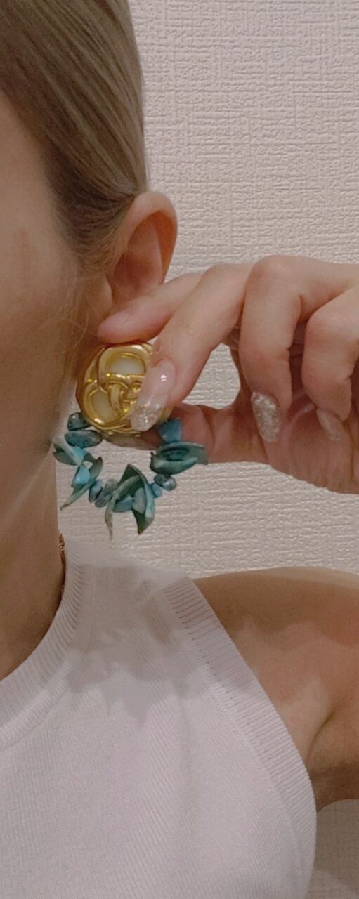 ランダムなシェルと、ターコイズが夏らしいピアスとなります。