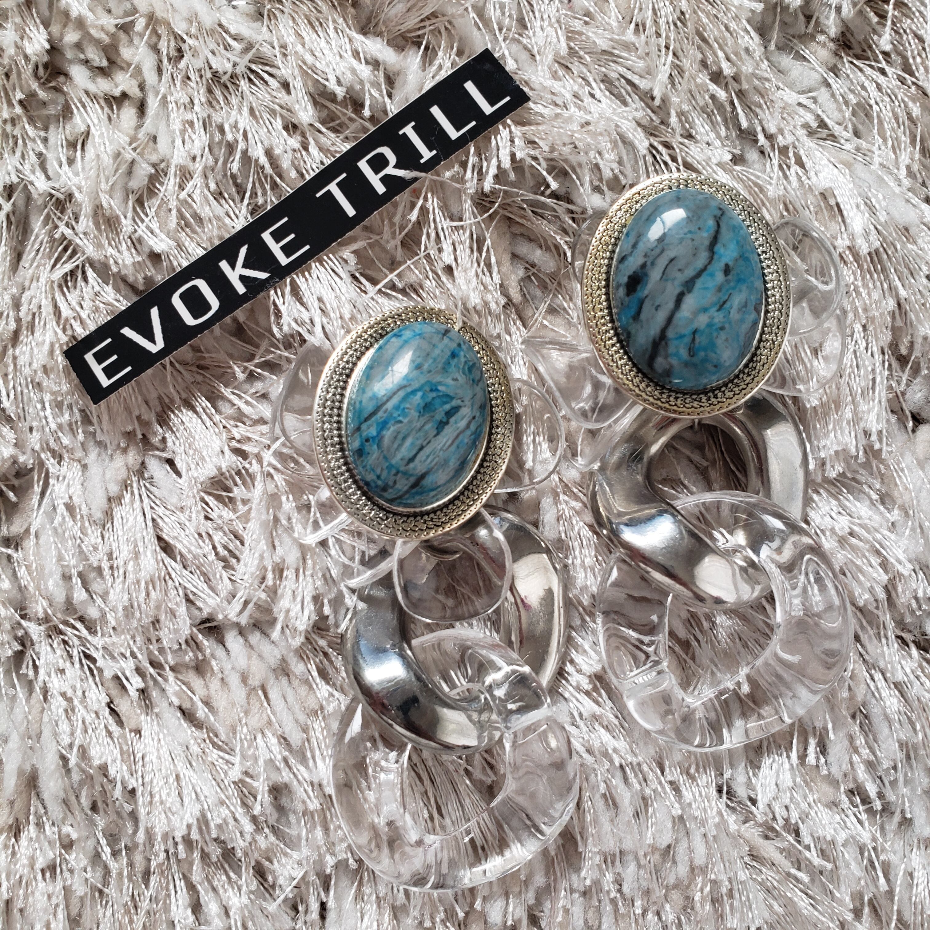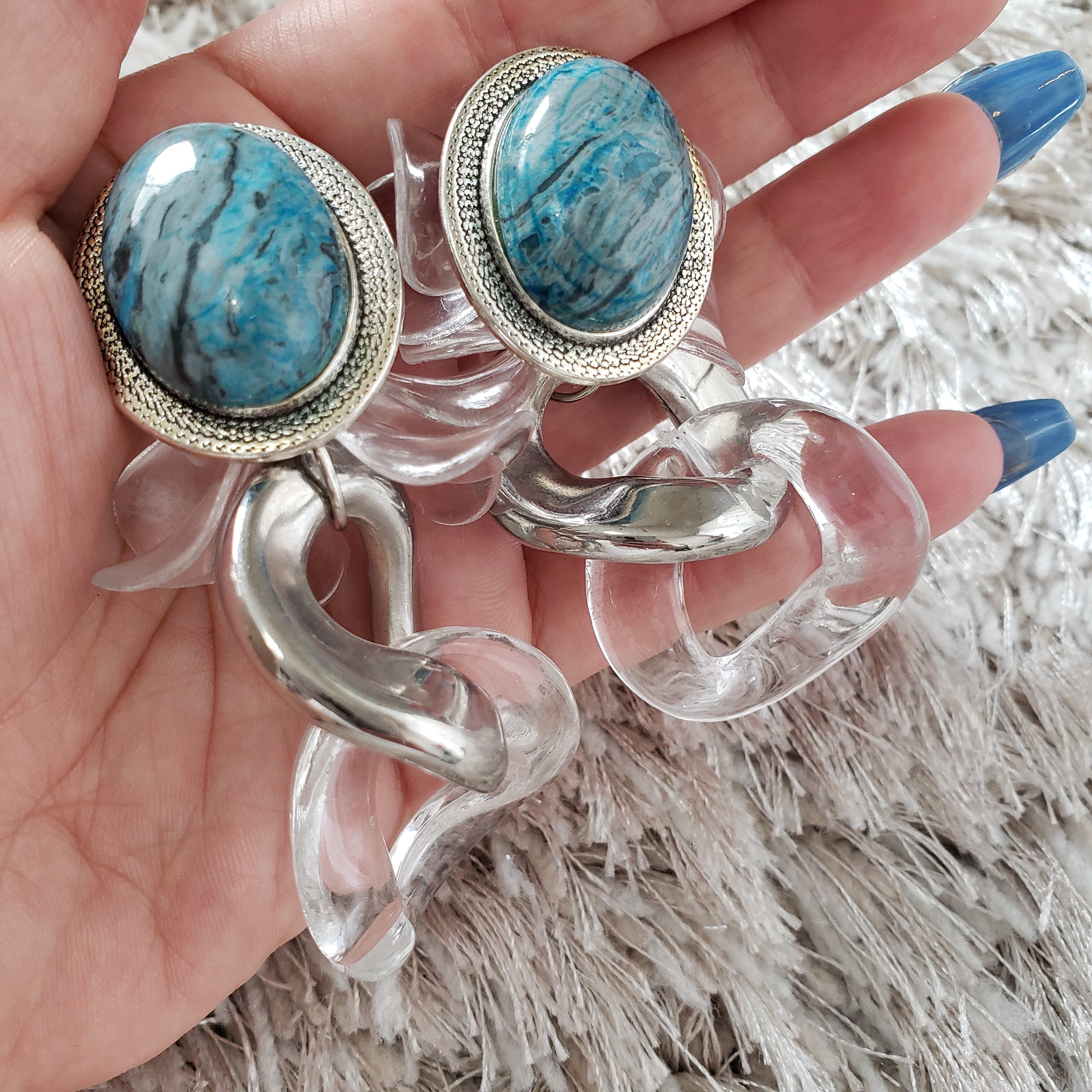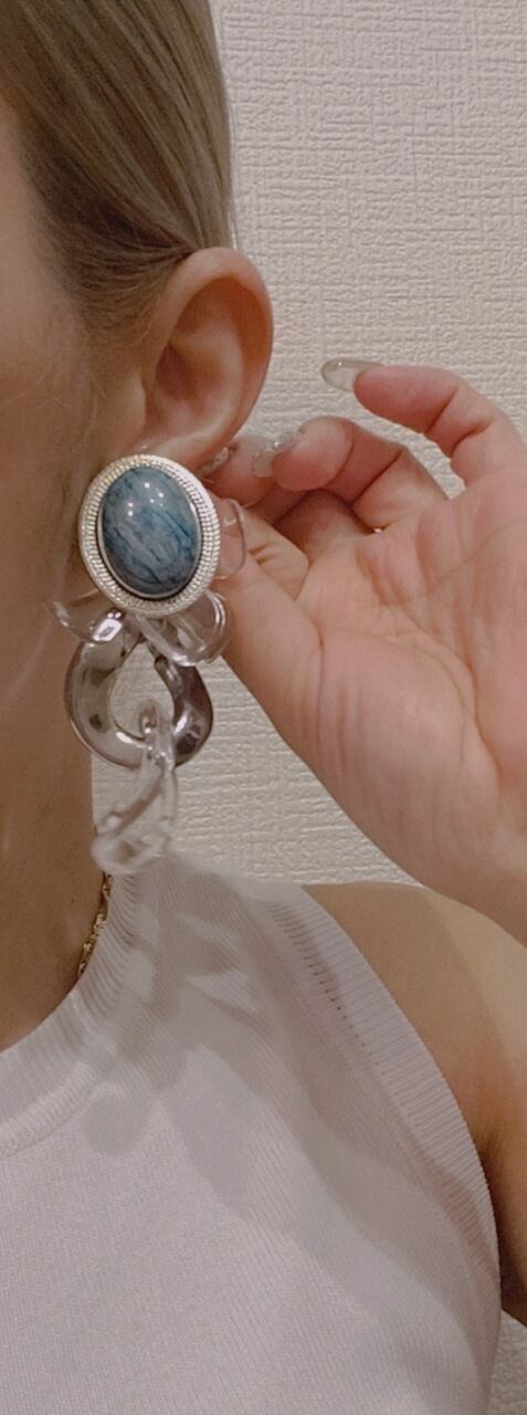 大きな天然石✕クリアとシルバーのインパクトあるピアスです。