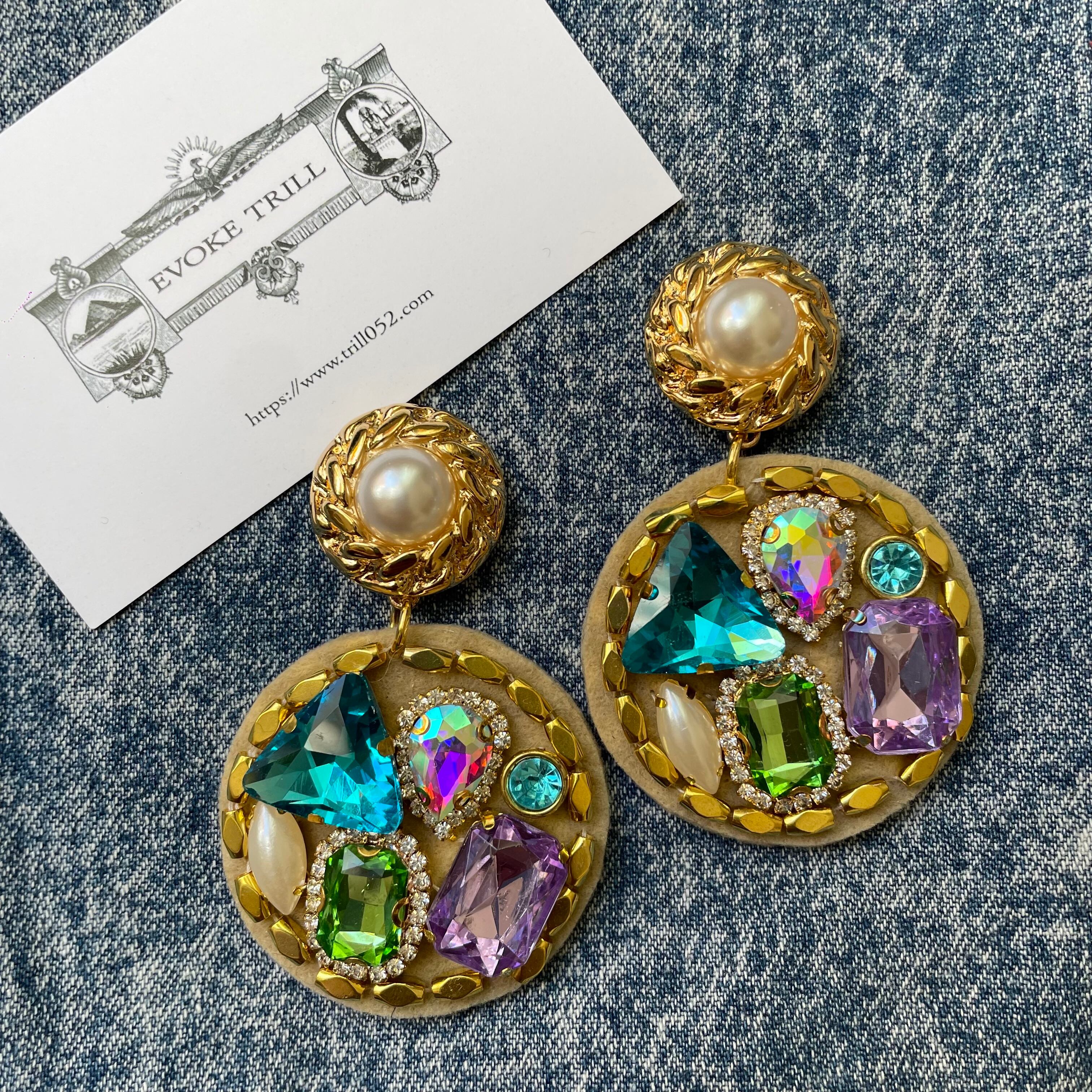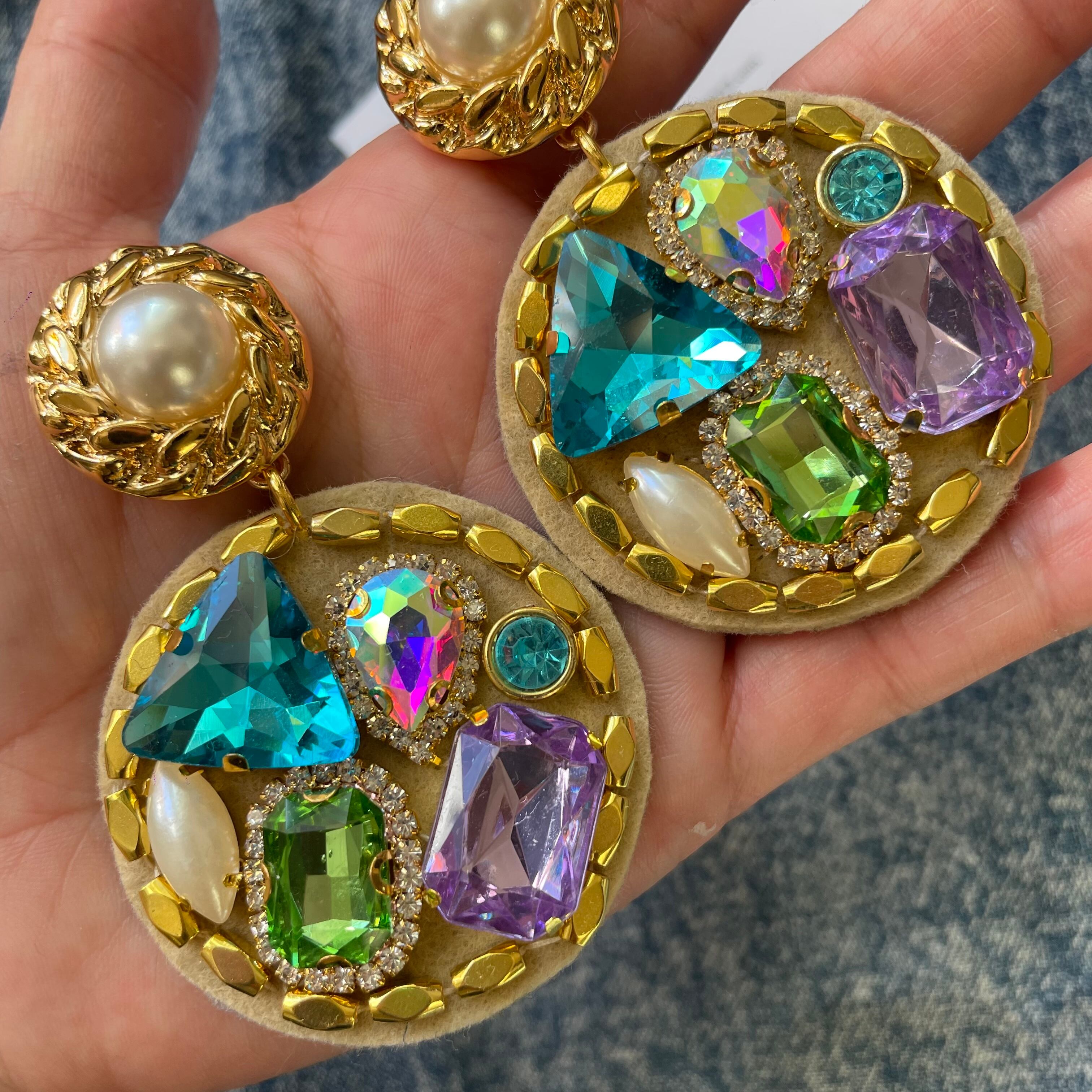 ビジューを詰め込んだギラギラのピアスとなります。