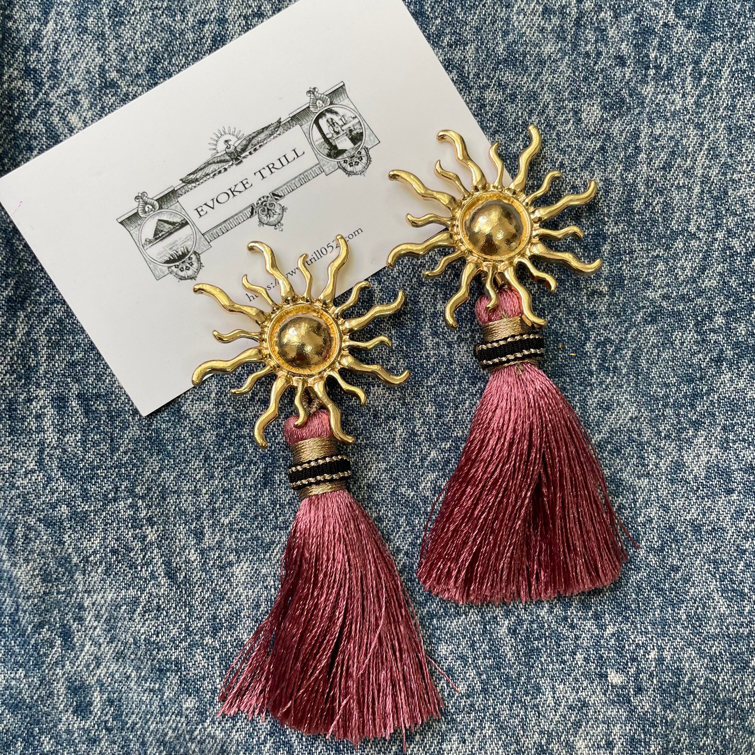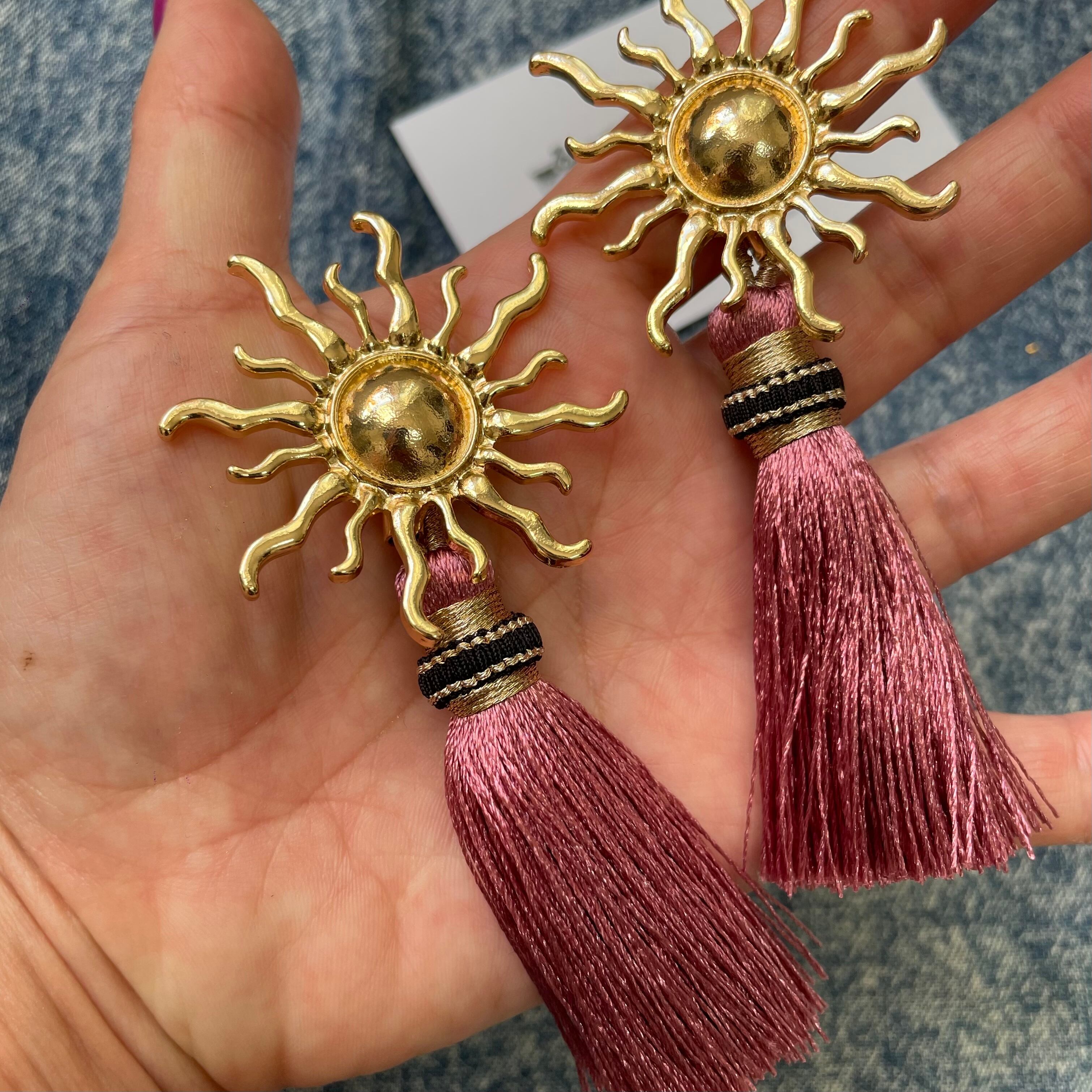 大ぶり太陽とフリンジのピアスとなります。